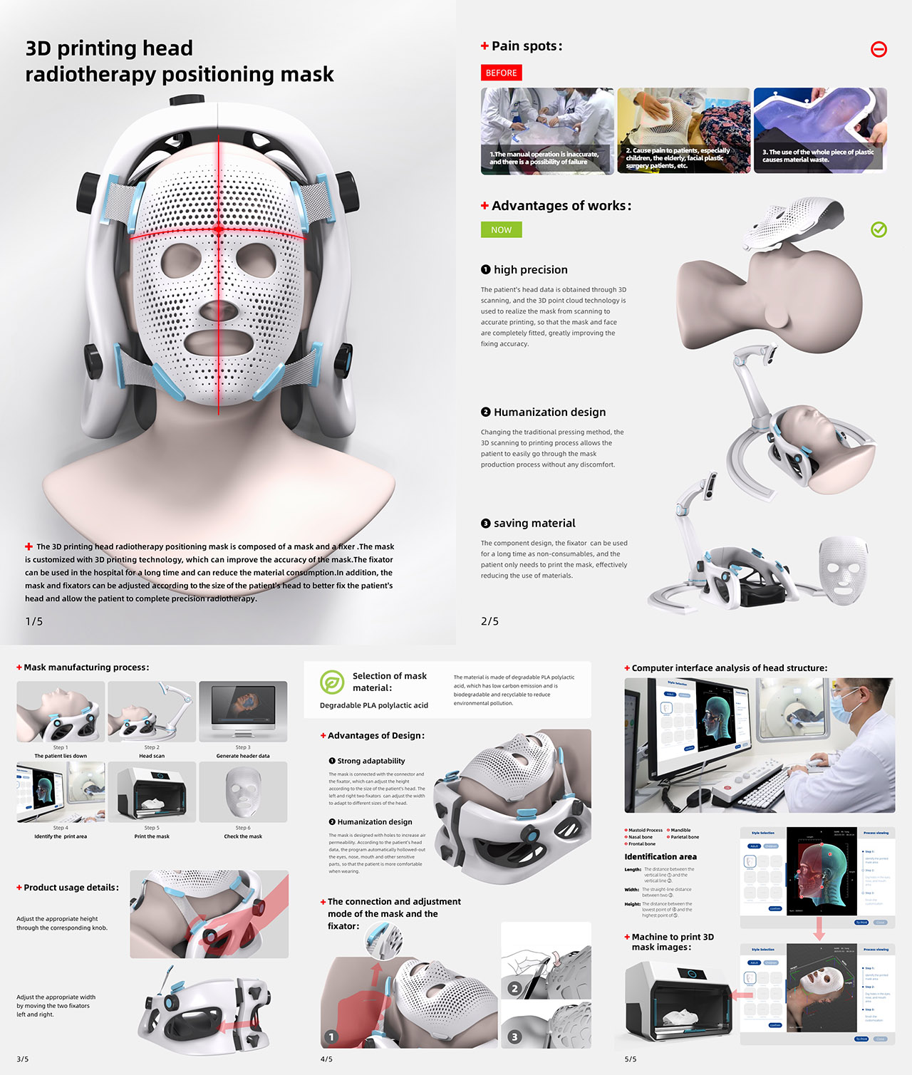 获奖作品由工业设计系副教授潘小栋,硕士研究生章孝楚,产品设计本科生宁杰,工业设计本科生赵依琳、陈明杰等共同完成。该作品聚焦头面部放射治疗患者,针对头部放射治疗过程中为避免误伤正常机体而产生的精准定位需求,师生们创新设计了基于3D打印的定位面罩及其衔接系统。这一设计改变了传统的热塑材料挤压成型方式所带来的高温不适、粗暴压迫、失败率高等缺点,可实现无感三维扫描与个体精准定制,通过人性化设计避免放射性误伤,同时让患者的康复治疗过程更保有尊严。