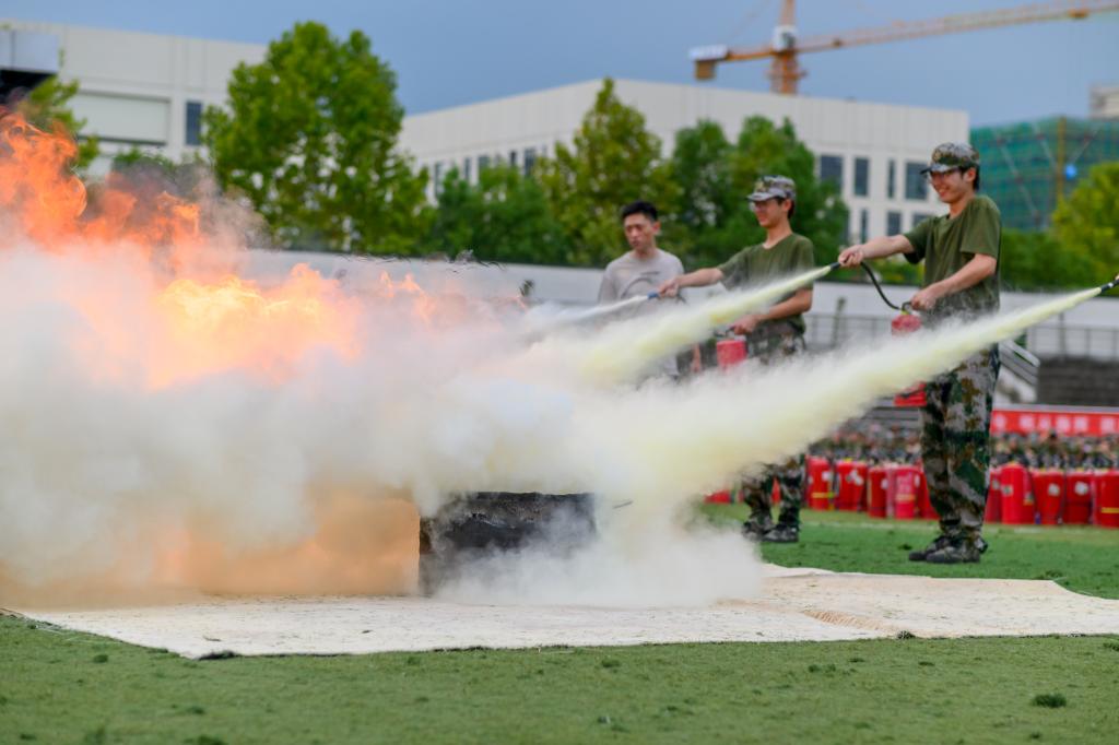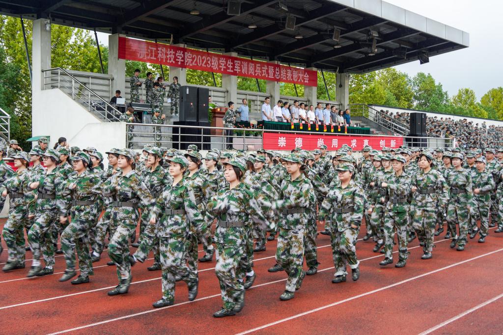 汇报表演中,阅兵式、分列式和军训科目展示相继举行。身着戎装的新生喊着铿锵有力的口号,迈着整齐矫健的步伐,展示自己的训练成果。