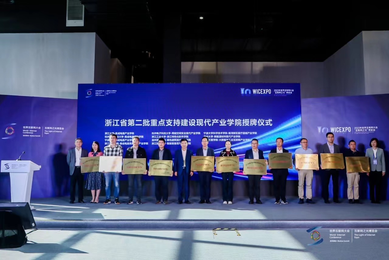 出席会议的省委人才办、省经信厅、省教育厅负责人为22家浙江省第二批重点支持建设现代产业学院授牌,米乐官网集成电路高端装备产业学院代表参加授牌仪式。