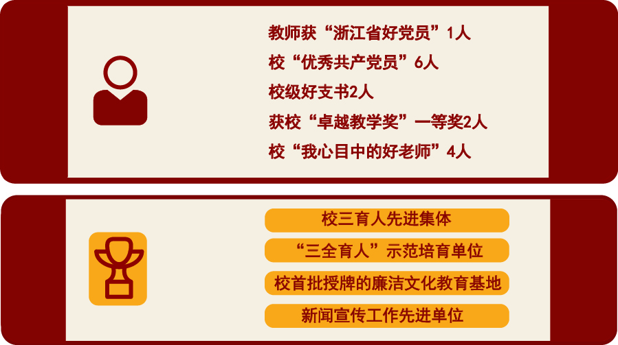 学院拥有一批具有优良师德师风的教师,教师中有“浙江省好党员”1人,校“优秀共产党员”6人、校级好支书2人,获校“卓越教学奖”一等奖2人,校“我心目中的好老师”4人,学院被评为校“三育人”先进集体、校“三全育人”示范培育单位、校首批授牌的廉洁文化教育基地、校新闻宣传工作先进单位等。近年来,在人才培养上成效显著。学院连续五年获得学校就业工作先进集体,学生优质就业率达50%以上,升学率达35%以上,涌现了全国优秀共青团员、“中国大学生自强之星”奖学金获得者、浙江省优秀共青团员、全省高校优秀示范团支部、浙江省暑期社会实践重点团队等优秀典型集体和个人。