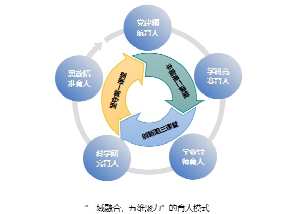 近年来,学院深度挖掘育人特色和亮点,构建了“三域融合,五维聚力”的育人新格局。有机结合校内校外资源,第一课堂全面推行课程思政,第二课堂重点推进“智能+”大学生创新中心的平台建设,校外实践第三课堂积极引入企业和地方资源协同育人。同时“五维聚力”,从党建、学科竞赛、学业导师制、科研创新、思政微品牌五个角度凝聚育人智慧,达到“全员、全过程、全方位”的育人成效。