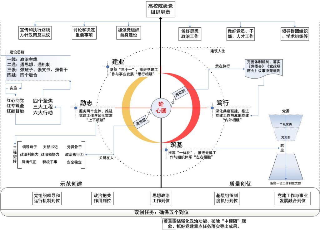 实施“红专筑垒”工程,构筑上下贯通、执行有力的严密组织体系。推进党支部与内设机构一体化设置,选优配强党支部书记,学院内设研究所所长均担任所在支部书记,建立支部书记与内设机构负责人联席会议制度。坚持问题导向,深化巡视巡察整改,开展党建质量提升行动,学院党委获校红旗党组织称号,多次党建工作考核优秀,获省高校微党课大赛一等奖,顺利通过省党建工作标杆院系创建验收。