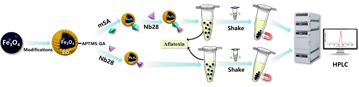 纳米抗体28 (Nb28) 是一种优良的黄曲霉毒素吸附剂,它在食品工业和生物分析测定实验中具有很大的潜力,但由于其结构缺乏二硫键而不稳定。本研究创新性地利用共价键固定技术以及单体链霉亲和素 (mSA)与生物素之间的特异性相互作用,将Nb28固定在磁性纳米颗粒 (MNPs) 上,构建了两个特异纳米复合物(MNP-Nb28和MNP-mSA-Nb28),其温度适应性、pH耐受性和稳定性均比自由纳米抗体有明显提升,具有较好的实际应用价值。在ppm级浓度下,MNPs-Nb28和MNPs-mSA-Nb28对黄曲霉毒素AFB1的最大吸附量分别可达193 μg·g-1和194 μg·g-1。研究成果有望应用在食源性痕量毒素的快速检测,守护“舌尖安全”。