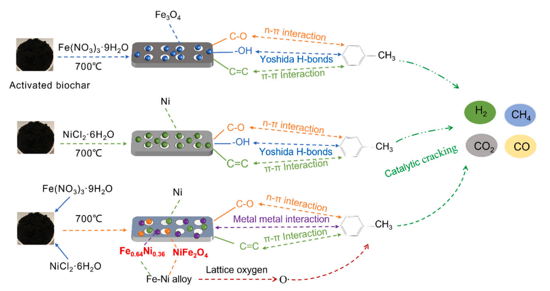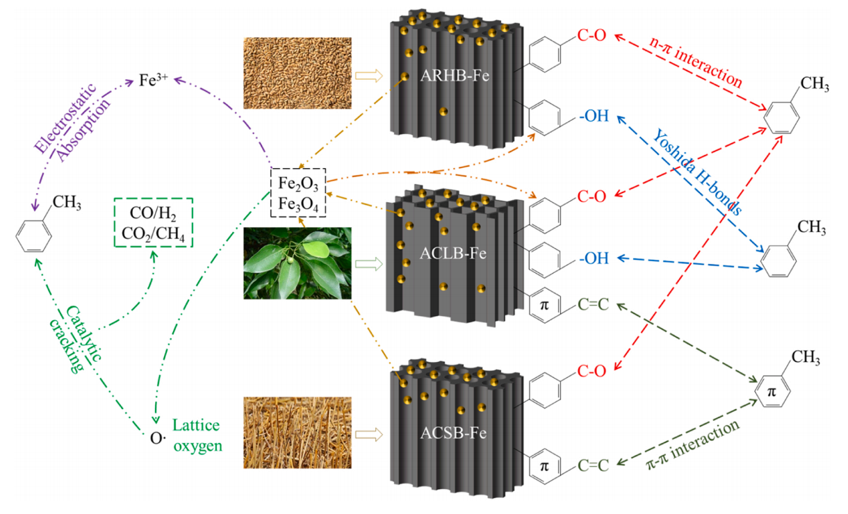 生物质气化技术是实现“双碳”目标及缓解气体能源短缺的重要方法之一,然而副产物焦油严重影响生物质气化技术的大规模应用。上述研究以不同农业废弃物为载体,合成了负载金属的生物炭基金属催化剂,以甲苯为焦油模型化合物,考察了催化剂对甲苯的脱除效果,揭示了生物质原料种类及铁镍金属负载对甲苯催化裂解的作用机理。上述研究结果表明不同生物质原料能够影响金属在催化过程中的赋存形态、化合价态以及生物炭内部的基团种类,从而影响生物炭对甲苯的催化裂解性能,而生物炭双金属催化剂能够在反应过程中形成Fe-Ni合金,强化晶格氧的形成,同时形成强吸附位点促进甲苯的催化裂解。相关研究发现能够为生物质气化过程强化焦油脱除和抑制积碳生成提供理论指导和技术参考。(机能学院)
