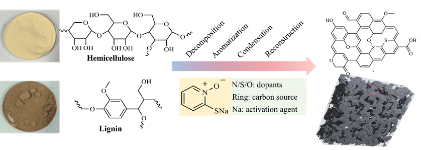 生物质作为一种可再生资源,具有绿色、可持续的特点。通过绿色工艺将生物质转化为掺杂活性炭,是当前储能领域的研究热点之一。活性炭的主流制备方法通常包含炭化与活化两个步骤,其中活化步骤往往需要引入强碱,具有一定的环境与操作风险。本研究报道了一种基于吡硫鎓钠盐试剂的生物质炭化活化“一步法”技术,可将木质素或半纤维素等生物质一步高温热处理制得颗粒均匀、孔隙度高、掺杂丰富的活性炭,在锌离子混合电容器体系中表现出优良的电化学性能。该技术为储能电极用掺杂活性炭的制备提供了一种简单高效、低毒低蚀、操作安全的替代方案。