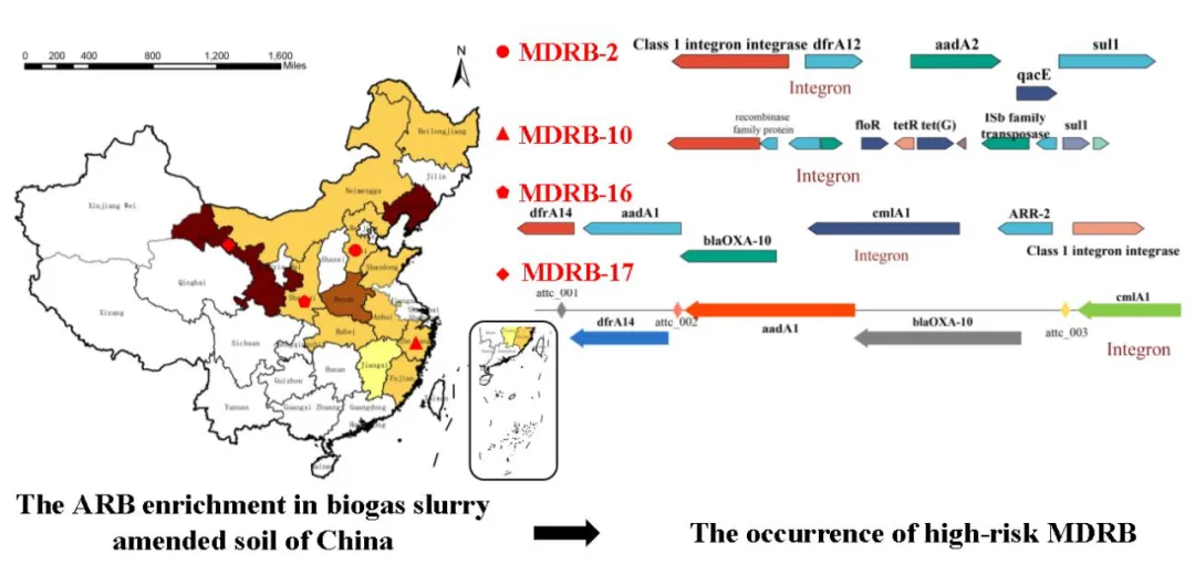 多重耐药细菌(Multi-drug Resistant Bacteria,MDRB)及其携带的高风险耐药基因(Antibiotic Resistance Genes,ARGs)正在严重威胁全球公共健康。沼液施用土壤作为耐药菌及耐药基因富集与传播的重要媒介,受到越来越多关注,但鲜有研究聚焦于沼液施用土壤中的高风险多重耐药菌及其携带的典型耐药基因。本研究通过评估中国12个地区的沼液施用土壤中细菌的耐药性,鉴别出不同地域背景沼液施用土壤中高风险多重耐药菌及其相关耐药基因种类,并进一步分析了上述高风险多重耐药菌的耐药及传播机制,以及它们在沼液施用土壤中富集及传播的潜在驱动因素,有助于丰富沼液施用土壤中耐药基因的数据库,为种养废弃物处理处置过程中微生物抗生素抗性问题的评估与控制提供理论基础。