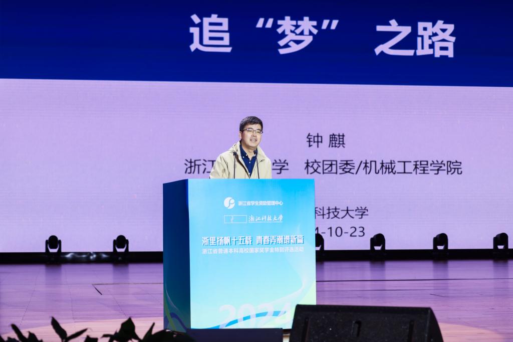 活动现场,2012年浙江省国家奖学金特别推荐获得者、浙江工业大学机械学院钟麒教授以《追梦之路》为题作分享。他结合自身求学、科研的经历和心路历程,鼓励青年学子要勇担时代重任,为实现中华民族伟大复兴贡献青春力量。