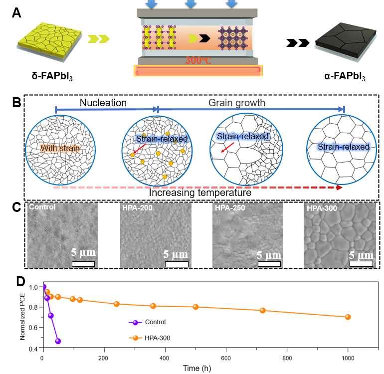 有机无机杂化卤化物钙钛矿太阳能电池(PSC)因其低制备工艺简单、成本低及高光电转换效率而备受关注。在金属卤化物钙钛矿中,α-FAPbI3因其合适的带隙宽度和较好的热稳定性而成为制备高效、稳定钙钛矿太阳能电池的理想候选材料。然而,高质量的无掺杂α-FAPbI3薄膜的制备仍然存在一定的挑战。该工作报道了通过高温热压辅助重结晶策略,在没有任何掺杂剂的情况下生长出稳定相纯α-FAPbI3薄膜。高温可以促进纯相α-FAPbI3的形成,通过重结晶过程释放钙钛矿薄膜中的应力并增大了钙钛矿薄膜晶粒。同时压力形成的限域空间有效防止了钙钛矿在高温下有机成分的挥发。基于此,最终制备的钙钛矿太阳能电池的光电转换效率高达24.06%,在85℃和85% 相对湿度下1000小时后,仍能保持其初始效率值的70%以上(如下图)。