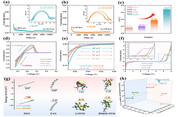 团队针对目前固态锂金属电池(SSLMBs)中的聚合物电解质聚氧化乙烯(PEO)存在的低离子电导率、狭窄的电化学窗口及不足的机械强度问题,从海星的独特结构--柔软外表与坚硬骨架结构汲取灵感,创新性地采用静电纺丝技术,设计出多功能“海星型”复合聚合物电解质(CPEs)。这一设计融合了聚丙烯腈/金属有机框架/离子液体(PAN/MOFs/ILs),构建出三维刚性骨架网络,为锂离子传输形成了连续且高效的传输通道:MOFs赋予骨架刚性,PEO作为缓冲外层提升界面相容性,而ILs则有效降低界面电阻,加速了锂离子的传输。制备的CPEs展现出良好的物理化学性能:优异的离子电导率、宽广的电化学窗口、均匀的锂离子通量以及高迁移数。这些协同优势在Li/CPEs/Li对称电池中得到了充分验证,该电池在1300多小时内展现出优秀的抑制枝晶生长能力。实验证明,在LiFePO4/CPEs/Li全电池应用中,经过2100次循环后,电池容量保持率高达90.1%。此外,通过深入的理论模拟和光谱分析,研究团队系统阐明了多组分固体电解质界面(SEI)的形成机制及其在稳定锂金属循环中的关键作用。这一受自然启发的设计理念,为开发更长寿命、更稳定的固态电解质开辟了广阔的前景,为SSLMBs的进一步发展奠定了坚实基础。
