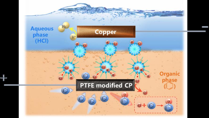 该研究针对团队前期开发的以盐酸为直接氯源的电化学氯化新工艺(ACS Sustainable Chem. Eng. 2024, 12, 3289-3297;CN117947434A)中,盐酸所含水分引发阳极竞争析氧副反应的问题,进一步开发出了上下双层的电化学合成反应新装置,通过物理隔离阳极与水相,显著抑制析氧副反应;采用平行电极布置方式,实现均匀电场强度分布,同时便于调节电极间距及扩大电极面积。此外,引入胶束强化两相间的传质效率。基于上述装置的优化设计,该研究显著提升了电化学氯化反应的法拉第效率,推动电能与盐酸的高效协同利用。