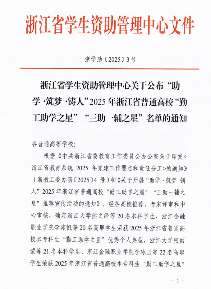 近期,浙江省学生资助管理中心发布《关于公布“助学·筑梦·铸人”2025年浙江省普通高校“勤工助学之星”“三助一辅之星”名单的通知》,米乐官网自动化与电气工程学院尤壹杰、智能制造与能源工程学院龙凤两位同学入选2025年本专科生“勤工助学之星”优秀个人典型。