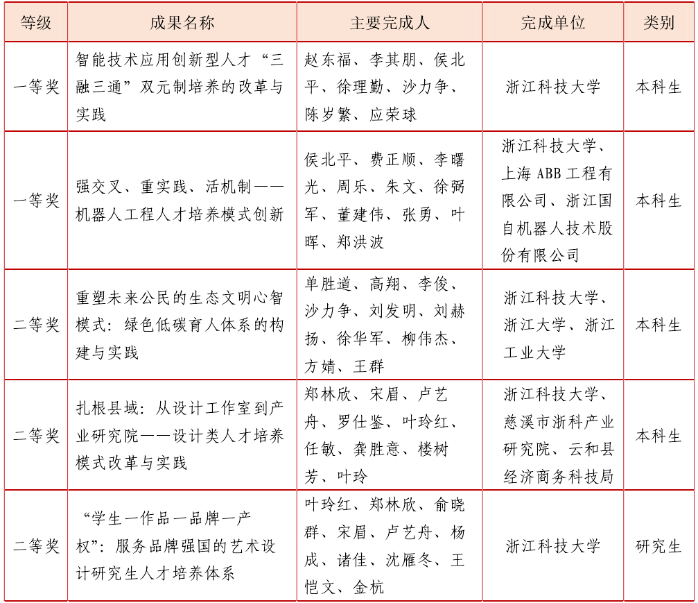 据悉,浙江省教学成果奖由省政府设立,每四年评审一次,分设基础教育、职业教育和高等教育三大类,旨在奖励在教育教学研究工作中取得显著教学成果的集体和个人,历来受到各高校高度重视。2025年浙江省教学成果奖高等教育类设特等奖25项、一等奖80项、二等奖100项。(教务处 陈洁琼、研究生院 范志庚)