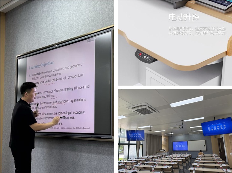 为优化育人环境,更好地适应教育数字化要求,学校抢抓暑期窗口期,基于“浙科智学”数字化教学综合平台项目升级小和山校区各类教室硬件设备,智慧教室新增98寸触控大屏、无尘化书写白板、电动升降讲桌,普通教室围绕教学必备的“一屏、一板、一桌”升级换代多类教学设备,141间教室新增录播摄像机282台、收音设备141套、电动升降讲台113个、大屏一体机102台、搪瓷书写白板102块,以及高清投影机、辅助显示屏、扩音系统、中控系统、电子班牌等,改善教学条件、提升师生教学体验。为用好新设备、发挥“智慧”功能,9月17至18日,教务处面向全体任课教师和教务员开展了为期2天的4场智慧教学培训活动,通过“理论讲解+实操演示”的方式,帮助教师尽快掌握数字化教学综合平台,赋能课堂教学创新。