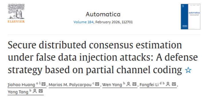 近日,智能感知与决策团队研究成果以长文的形式正式发表在《Automatica》上,论文题目为“Secure Distributed Consensus Estimation under False Data Injection Attacks: A Defense Strategy Based on Partial Channel Coding”(点击阅读),电气学院黄家豪博士为论文第一作者,米乐mile体育官网为第一单位。