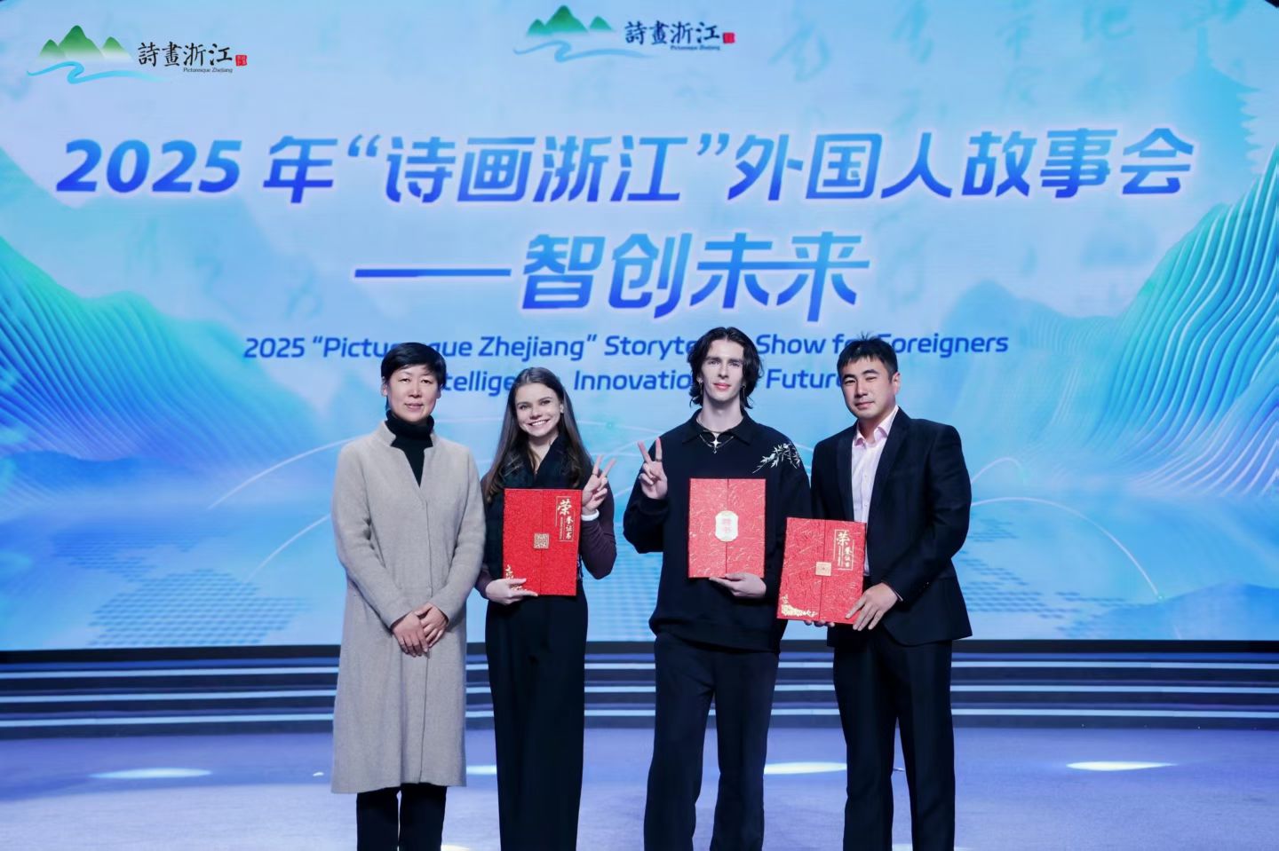 近日,2025年“诗画浙江”外国人故事会——智创未来颁奖典礼在杭州举行。米乐官网哈萨克斯坦籍学生妮娅(KHLYOSTKINA XENIYA)获“优秀作品奖”,法国籍安乐德(PECHILLON LEANDRE COME)获“最佳制作作品奖”,安乐德还被授予“嗨游”(全国首个省级入境旅游智慧服务平台)海外推荐官称号。学校获评“最佳组织奖”。