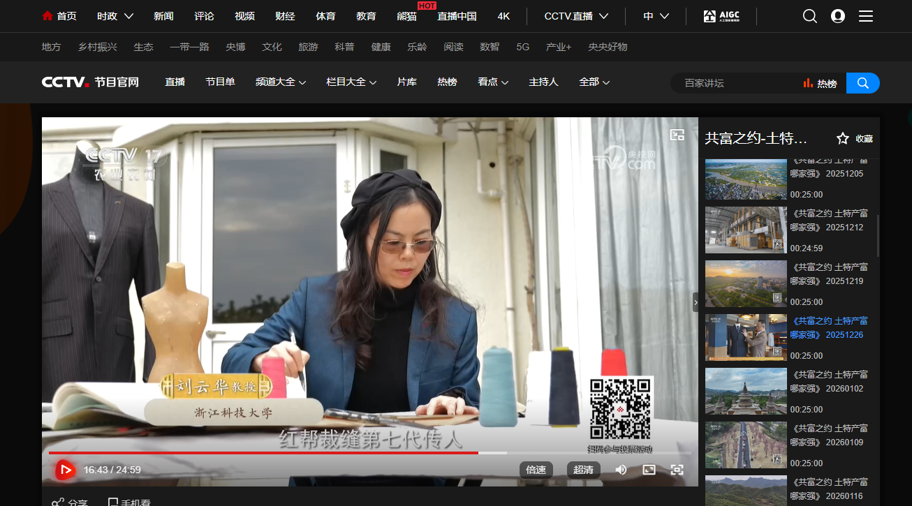 《共富之约——土特产富哪家强》(点击观看)第6期节目中,艺术学院刘云华教授出镜,为大家讲述“百年技艺看我红帮裁缝 一针一线裁出美好生活共富路”故事。节目记录了刘云华教授与其师江继明两代红帮裁缝二十年载的传承故事。访谈中,刘云华教授系统阐述了红帮裁缝的历史源流、技艺传承与时代贡献。她还将红帮精湛的工艺与精益求精、开拓进取的工匠精神,深度熔铸于课堂教学之中,她主讲的《服装结构设计》等课程上,学生们不仅学习到扎实的专业技艺,更深刻感受到传统文化的精神内核。刘云华教授长期致力于红帮裁缝历史与技艺的系统性研究、保护与教学传承,主持国家级、省市级课题20余项,其专著《红帮裁缝研究》荣获浙江省哲学社会科学优秀成果奖二等奖,《红帮服饰文化研究》获批国家社科基金后期资助项目,成果得到业内专家的高度认可,产生了广泛的社会影响力,成为红帮文化研究的标志性成果。