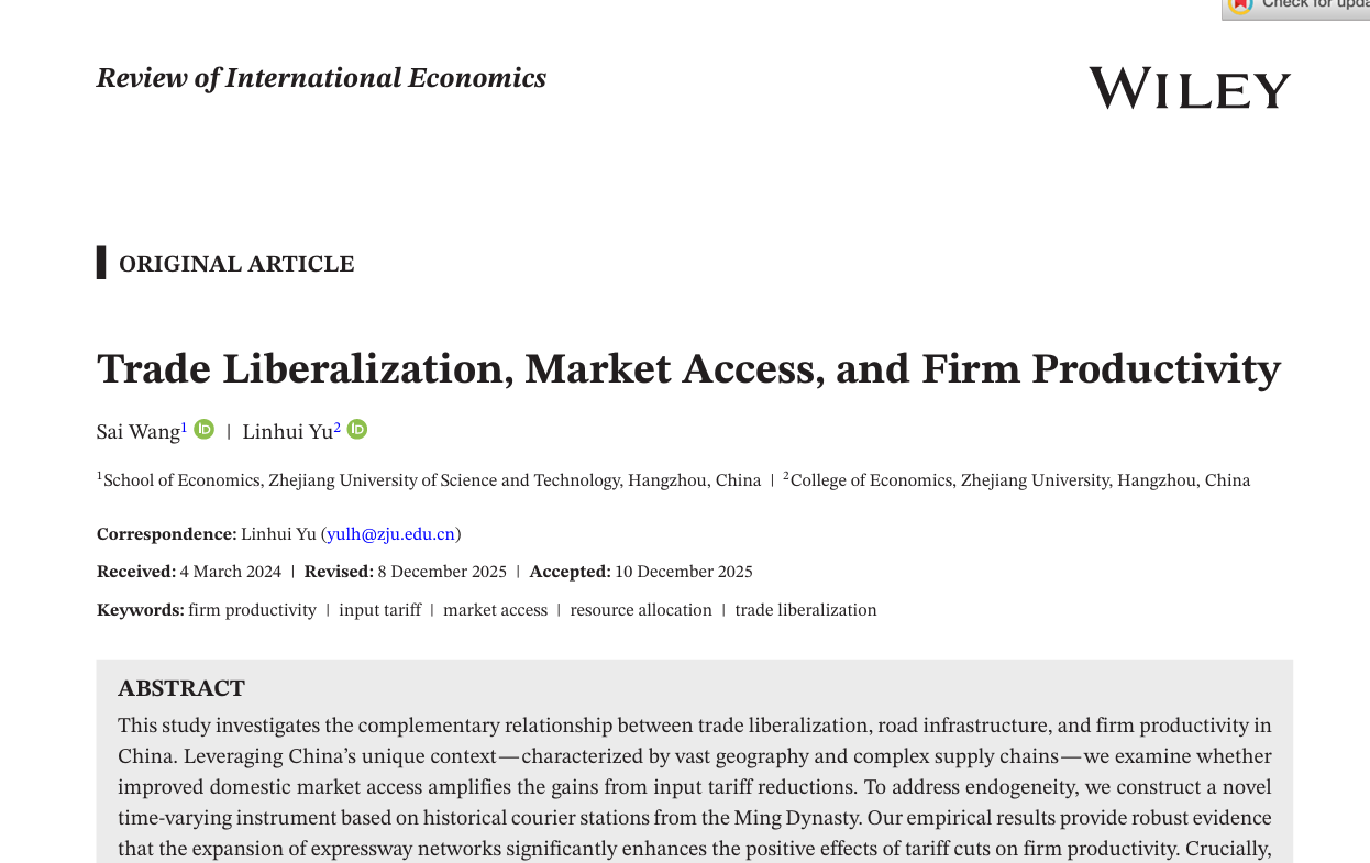 近日,经济学院开放型经济学科团队与合作者撰写的学术论文《Trade Liberalization, Market Access, and Firm Productivity》(点击阅读全文),在国际经济学领域权威期刊《Review of International Economics》上发表。经济学院青年教师王赛博士为第一作者,米乐mile体育官网为第一完成单位。