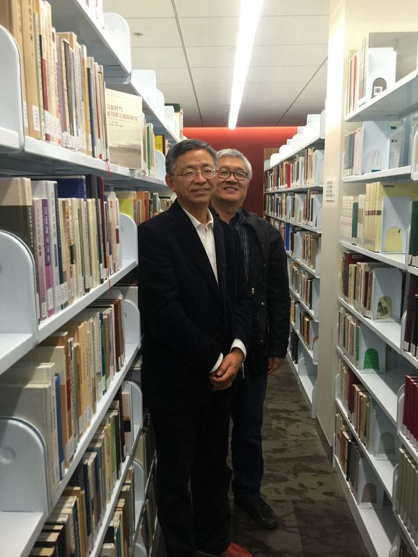 图4:王建华主编的《信息时代报刊语言跟踪研究》为斯坦福大学东亚图书馆收藏,与斯坦福大学东亚系孙朝奋教授在图书馆。