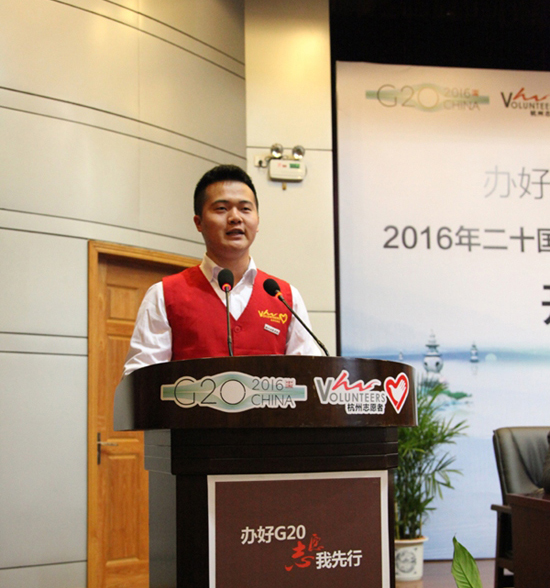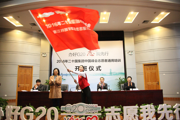 周扬向米乐官网2016二十国集团中国峰会志愿服务队代表授旗。
