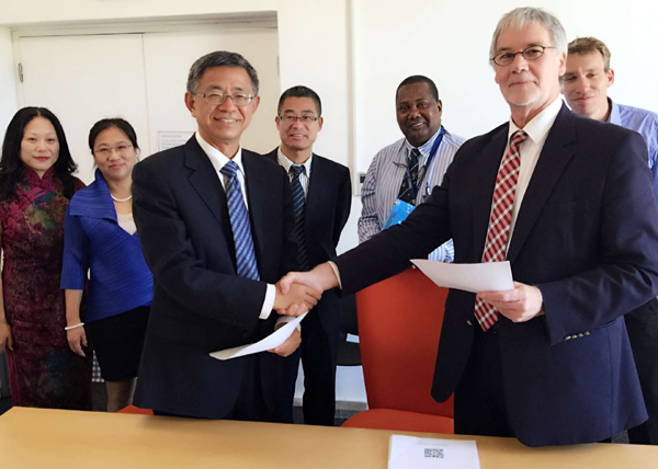 图1、2:王建华与开普敦大学副校长、赞比亚铜带大学副校长交换合作协议交换合作备忘录