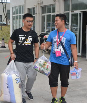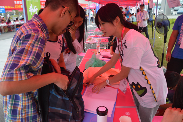 市场营销151班小余,既是新生也是志愿者。今年,延续去年的“传统”,近300名新生提前到校,参与了迎新志愿服务。小余和伙伴们佩戴粉红色的工作证,一早就上岗了,出现在记者面前时,她正“熊抱”着一个新生的行李,满头大汗。