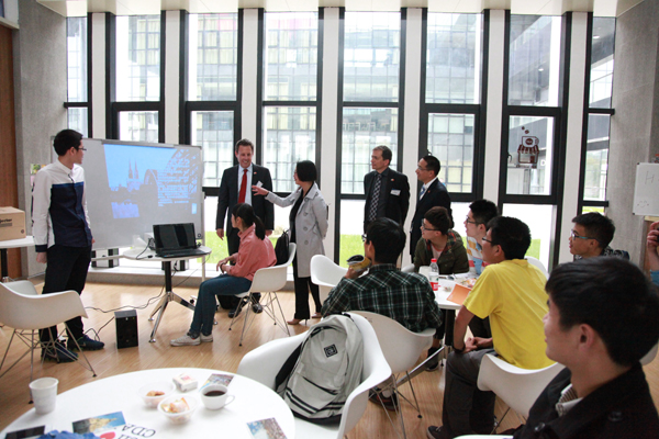 学校相关职能部门、二级学院负责人及学生代表等参加欢迎仪式。欢迎仪式后,德国客人参观校园,并在中德工程师学院I-cubic咖啡吧与正在开展活动的学生交流。