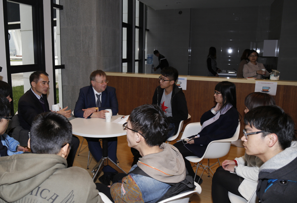 报告后,科尔希在叶高翔等陪同下来到中德工程师学院I-cubic-Café咖啡吧。在这个“说外语喝免费咖啡”的学生自主运营咖啡吧,科尔希与同学用德语、英语交流,他提醒大家不要放松外语学习,锻炼自己的跨文化交际能力,为日后在中德合资企业里发挥管理才能做最完善的准备。