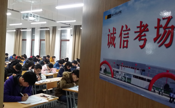 2014级新生入学,学校便将诚信教育摆在突出位置。安吉校区学生事务中心向全校学生发出了“以诚信考试为荣,以考试舞弊为耻”的倡议书,“诚信考试”签名活动得到众多同学响应,通过壁海报、横幅、微信平台广泛进行“诚信”宣传。在日前举行的学生学术诚信宣誓仪式上,近四千学生填写“诚信考场承诺书”。考试期间,考场内外张贴悬挂“既考成绩,更考人格”、“坚守心灵的诚信,提升人生的品位”等标语提醒同学。学校还出台措施,确保“诚信”在阳光下行走,保证参与同学的权利,也明确相应的处罚。