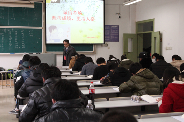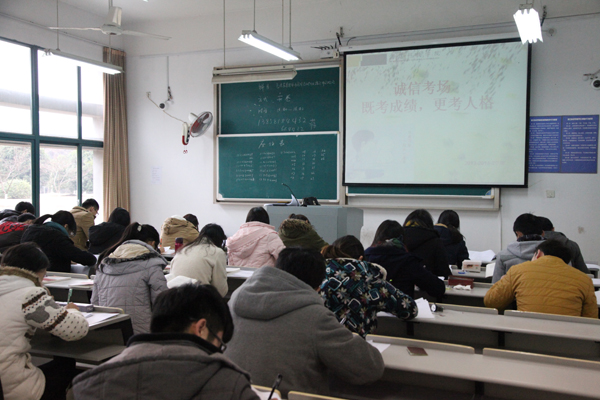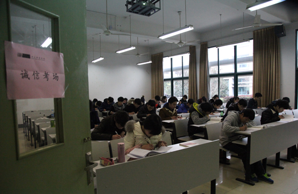 本次期末考试,小和山校区思政理论课继续实行无人监考“诚信考场”,还有部分专业课考试也尝试“诚信考场”,共有超过五千人次学生参加考试。巡查中看到,“诚信考场”内考生认真答题,秩序井然。为了让“诚信”真正深入人心,学校在考前进行相应宣传教育,考生在参加考试前要填写“诚信考场承诺书”,考场内外“既考成绩,更考人格”、“坚守心灵的诚信,提升人生的品位”等标语,“请不要歪头”等漫画都在提醒同学诚信应考。学校还出台措施,确保“诚信”在阳光下行走,保证参与同学的权利,也明确相应的处罚。