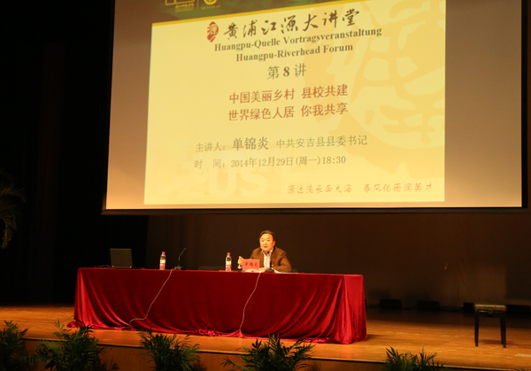 12月29日晚,黄浦江源大讲堂第8讲在安吉校区学生活动中心举行。中共安吉县委书记单锦炎围绕“中国美丽乡村,县校共建;世界绿色人居,你我共享” 主题开讲。报告会前,校党委书记王建华为单锦炎佩戴校徽,校长叶高翔向他颁发客座教授聘书。校党政领导班子成员周加敏、冯军、毛建卫,校长助理鲁伟权等出席报告会。八百余名师生及部分安吉市民参加。