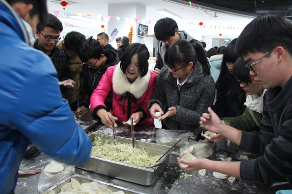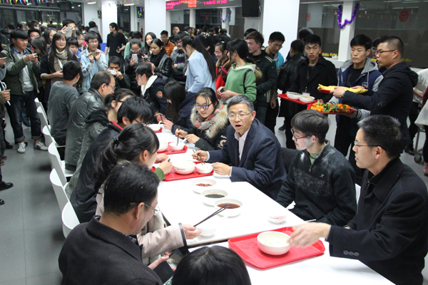 2014年安吉新校区建成,第一批学生入学,为让刚离开父母的大一新生不寂寞。学习组织师生动手包象征团圆的饺子,用“饺子宴”喜迎新年。安吉校区后勤事务中心、学生事务中心等为此做了精心准备。