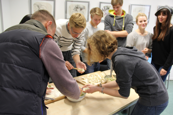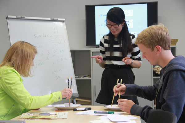 德国埃尔福特孔子学院则于26日举行“孔子学院开放日”活动。简朴又隆重的开幕式以后,孔子学院教师给当地民众呈现了一场中国语言与文化的盛宴。中方院长李康康亲自示范包饺子,德国民众兴致盎然地动手学习(图3);汉语教师们为德国民众开设了汉语体验课堂,对汉语饶有兴趣的德国学生与市民纷纷加入(图4),认真学习汉语拼音和基本笔画;孔院志愿者给观众带来精彩的茶艺表演、太极表演、书画展示以及中国乐器琵琶演奏,参与者纷纷赞叹中国文化的无限魅力。另外,孔院还安排了“印象浙江”摄影图片展,广大德国观众驻足观赏、流连忘返。有观众还参与了中国知识问答。