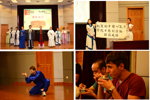 开幕式以“我的中国心”为主题,对中华文化进行了多角度的展示。伴随着声声古韵和精准的解说,现场观众被瑰丽多姿的汉服文化所深深吸引,在中国古老乐器埙、箫、笛的美妙演奏中,中国学生的精彩书法向本次活动献上了美好的祝福。来自罗马尼亚的留学生王博表演的中国武术,融长拳、猴拳、醉拳于一体,赢得在场观众的阵阵掌声,来自七碗茶社的同学在中国典雅的乐曲环绕下为现场的观众表演了中国茶艺,赏茶、泡茶、品茶的过程中,让大家感受到了中国茶文化的韵味与魅力。身着汉服的中外学生共同诵读《少年中国强》为开幕式画上圆满的句号。