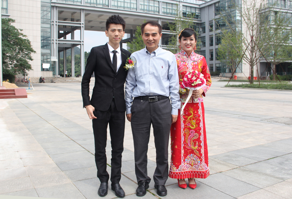 9月21日,校园迎来一对新人——2007届教育技术学专业校友沈晓红、廖银亮,当天是他们的新婚大喜之日。上午,他们在同学们陪同下重回母校。正在学校参加国际学术会议的校长叶高翔教授乘车路过,当即下车向新婚新人送上祝福。他希望沈晓红、廖银亮以及所有校友都把母校当做自己的家,常回家看看,关注支持学校的发展。沈晓红、廖银亮对校长祝福表示感谢。