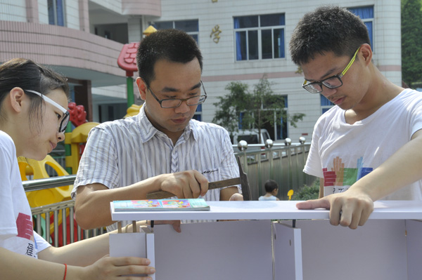 在一周的时间里,队员们围绕着耕耘梦、青春梦、和谐梦与夕阳梦,为塔石带去了爱与希望。塔石乡没有书店,山路又十分崎岖,孩子们买书非常困难,只能通过老师每学期订购一两本,可这无法满足孩子们对知识的渴求。“姐姐,你能带本书给我吗?”孩子们怯怯的要求让所有队员动容。在去年捐赠了价值800元的书籍后,今年团队通过募集向该校捐赠了一个流动爱心书架(图3师生共同完成书架制作),其中包括书本、体育用品等,助孩子圆“读书梦”。