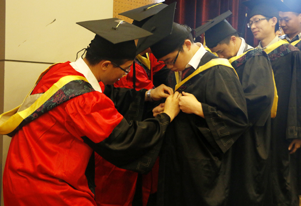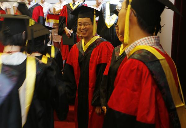 6月18日下午至19日,2014届本科生学士学位授予仪式举行。校党委书记王建华教授、校长叶高翔教授与毕业生合影留念。毕业生从校领导及校学位委员会成员手中领取自己的学位证书。师长为每位同学拨正学士帽上的流苏。