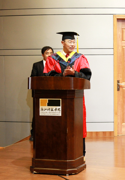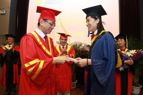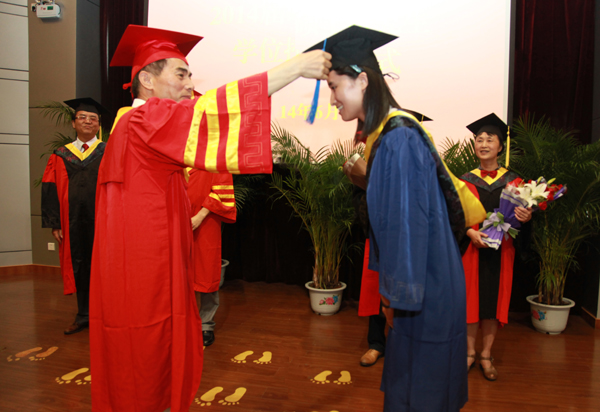 6月18日下午,学校首届硕士研究生学位授予仪式举行,生化学院付阳同学获得了学位证书。校党委书记王建华教授为她颁发优秀毕业生荣誉证书。校长叶高翔教授为她拨穗并颁发学位证书。