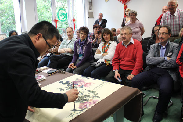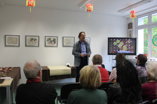 开幕式上,孔院中方和德方院长分别致辞。李治老师做关于中国印章篆刻艺术的报告,详细阐述了印章的起源、发展及其演变等。他还以实物举例,生动讲述了印章艺术的特色。蕾娜•莫尔女士简要讲述了自己学习中国画的契机,并简要分析了中国画与西方油画的异同等。杜俊立老师和蕾娜女士现场即兴合作,共同绘制了一幅精美绝伦的画作,并由李治老师盖上亲手篆刻的印章。这种新颖的模式使德国观众叹为观止,也让他们近距离领略了中华艺术的魅力。