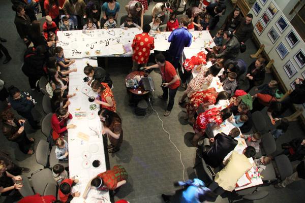表演前,孔子学院的互动展台就吸引了前来参加活动的孩子和家长。书法互动台前,孩子们专心写着中文“马”字,一幅幅作品或奔放,或雄壮,透露着汉字的文化底蕴和孩子们浓厚的兴趣。中国画互动台前,孔院老师教孩子们神奇的吹墨中国画。孩子们一人一支吸管,在纸上创作梅花。花枝遒劲,花瓣鲜红,各具特色,大有百花迎春的意味。中国传统游戏互动台前,孩子们发挥自己的聪明才智,用七巧板拼接着各种小动物的图案。