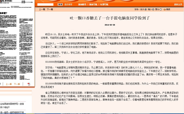 2月28日,“都市快报”报导米乐官网生化学院化工专业张同学在公交车上捡到一台笔记本电脑,主动找到失主归还的事迹(http://hzdaily.hangzhou.com.cn/dskb/html/2014-02/28/content_1681998.htm)。