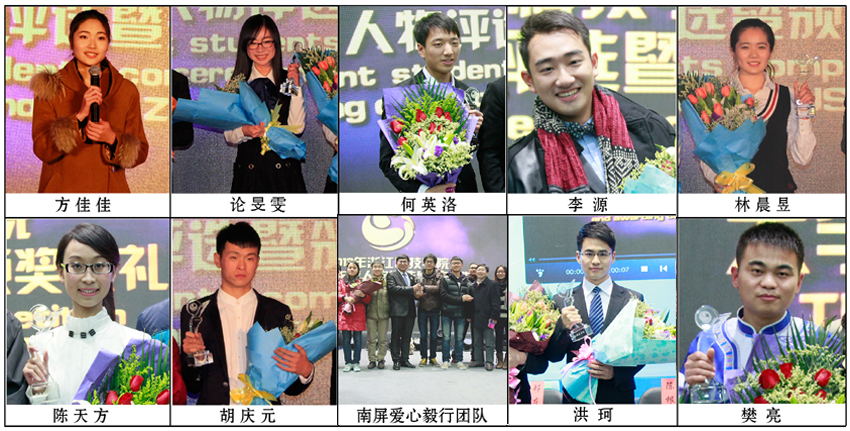 何英洛 生化学院化工112班(励志类) 家庭经济环境苦难的他,在校期间,积极参与勤工助学以减轻家庭负担。现担任生化学院院报《生化三实报》主编,生化学院社团联合会主席,生化学院牛讯文化传媒社副社长。曾任助理班主任。成功申请浙江省“新苗人才计划”立项2项,校“挑战杯”大学生课外学术科技作品竞赛三等奖,校“定格和山”摄影大赛三等奖,成功申请外观专利。连续两年获国家励志奖学金,荣获校一等奖学金,“王老吉助学行动”资助。2012、2013浙江省暑期社会实践优秀团队成员。曾获”三好学生“,“优秀学生干部”“优秀社团干部”,“暑期社会实践先进个人”,“风采杯”辩论赛最佳辩手等荣誉称号。