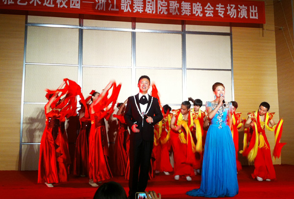 本次高雅艺术进校园活动是由浙江歌舞剧院演出的综合性歌舞晚会专场,节目有歌唱、乐器演奏、舞蹈等多种形式,受到师生们的热情欢迎。晚会在充满节日气氛的歌舞《举杯吧,朋友》中拉开帷幕,嘹亮诙谐的唢呐独奏《打枣》、充满民族风情的女子舞蹈《邵多丽》、辉煌明亮的意大利民歌《我的太阳》、动感时尚的现代舞《兄弟》、充满特色的二胡与双排键乐器组合《 采茶新韵 》……一个个精彩的节目让观众们流连忘返,现场响起了阵阵热情的掌声,晚会在热烈欢快的歌舞《欢聚一堂》中圆满结束。