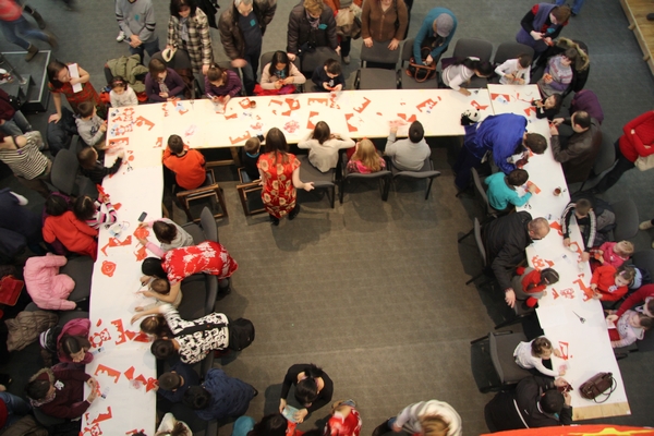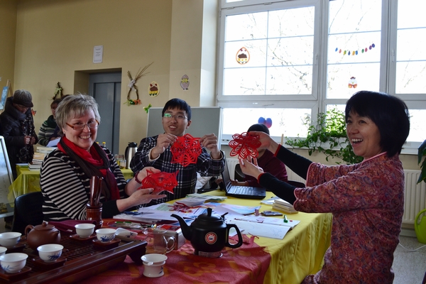 图1:埃尔福特孔院教师向德国友人展示剪纸文化