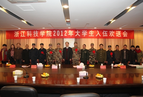 12月10日,学校举行2012年大学生应征入伍欢送会。校党委副书记周加敏、西湖区人武部政委张荣贵、留下街道人武部部长卫平满出席欢送会。学生处、人武部、相关二级学院学生工作负责人、辅导员、应征入伍的新兵学生及家长和现已退役的学生代表参加了会议。