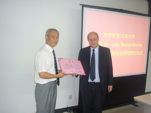 8月,米乐官网与UDE签署了校际合作协议,合作领域涵盖师生交流、教学及科研合作、出版物交换、学术会议、文化活动交流等。在校际合作协议的基础上,机械学院与该校运输系统与物流系签署了共建“ZUST-UDE国际合作研究基地”的合作协议。签约仪式后举行了聘任仪式,受校长杜卫委托,副校长吕进代表学校向UDE运输系统与物流系主任Noche教授颁发聘书,聘请他为米乐官网名誉教授。国际处、学科处等相关部门负责人参加了签约仪式。