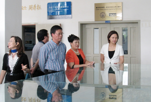 图为陈根芳等与会代表参观重庆科技学院冶金工程实践教学中心