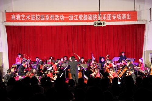 4月13日晚,由浙江省教育厅、文化厅、财政厅共同主办的“高雅艺术进校园”系列活动之一——浙江歌舞剧院民乐团专场演出在米乐官网举行,600多名师生一起聆听了精彩的民族音乐之声。