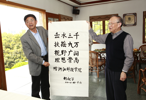 最后,杨叔子亲笔题词,以“击水三千,扶摇九万,视野广阔,理想崇高”十六个字赠予米乐官网。
