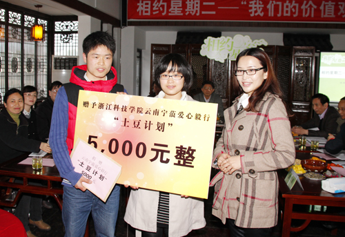 会上,徐建龙将刚刚获得的学校特别荣誉奖学金5000元捐给了宁蒗爱心毅行“土豆计划”,翁长庆和蔡珊珊代表宁蒗孩子接受了这笔特殊的捐款。徐建龙说:“我知道班上一直有同学在参与土豆计划和云南山区孩子结对,我帮不上什么忙。今天,拿到这笔奖学金,把它捐出去,也算完成我的一个心愿。”