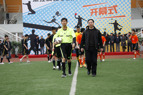 赵东福为本次运动会首项比赛学生足球赛开球。